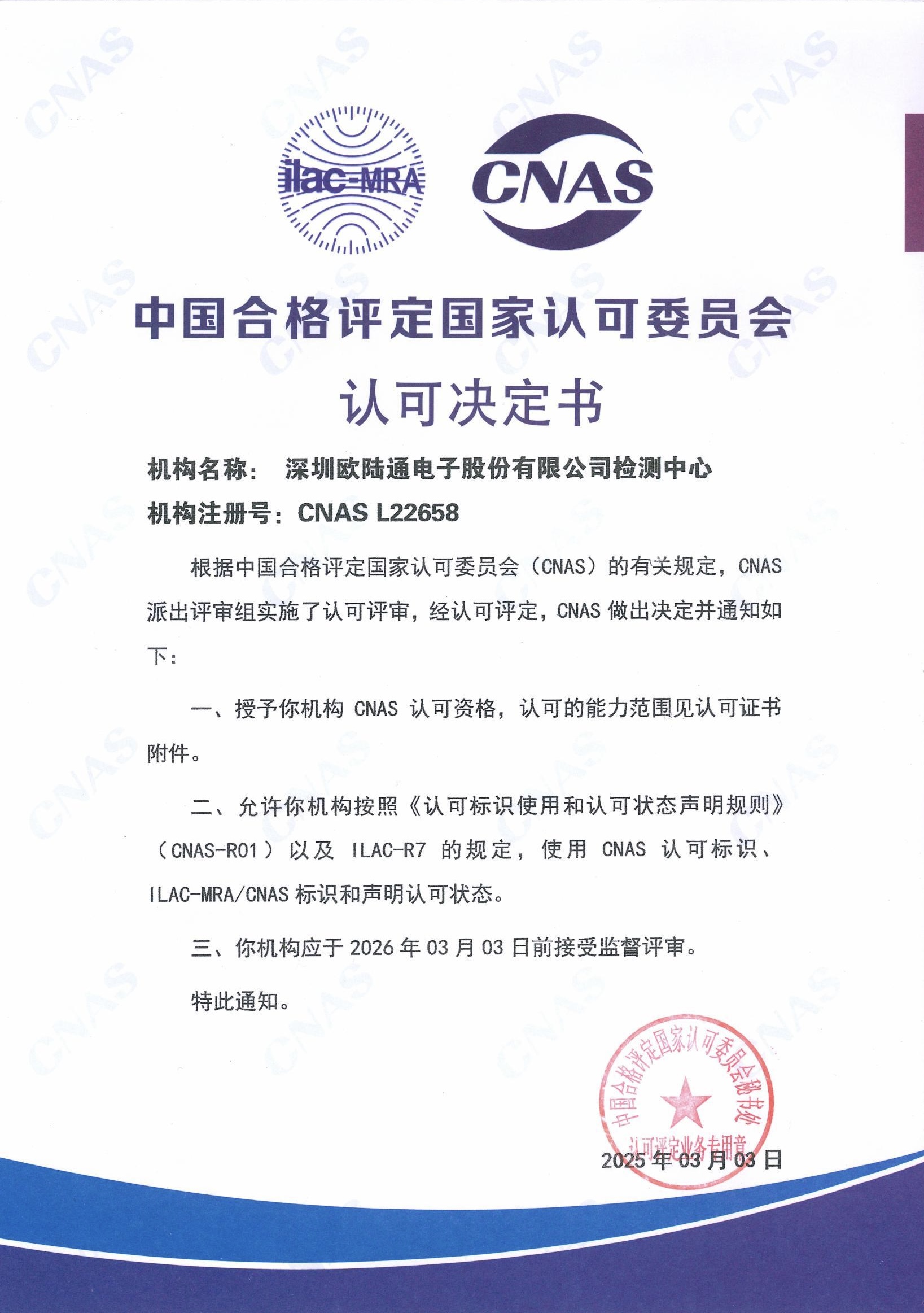 近日,歐陸通實(shí)驗(yàn)室順利通過了中國合格評(píng)定國家認(rèn)可委員會(huì)(CNAS)資質(zhì)評(píng)審及合格評(píng)定,榮獲國家級(jí)CNAS實(shí)驗(yàn)室認(rèn)可證書,標(biāo)志著公司實(shí)驗(yàn)室的測(cè)試能力與管理體系已達(dá)到國際互認(rèn)水平,檢測(cè)報(bào)告和結(jié)果可實(shí)現(xiàn)在全球上百個(gè)國家和地區(qū)的互信認(rèn)可。