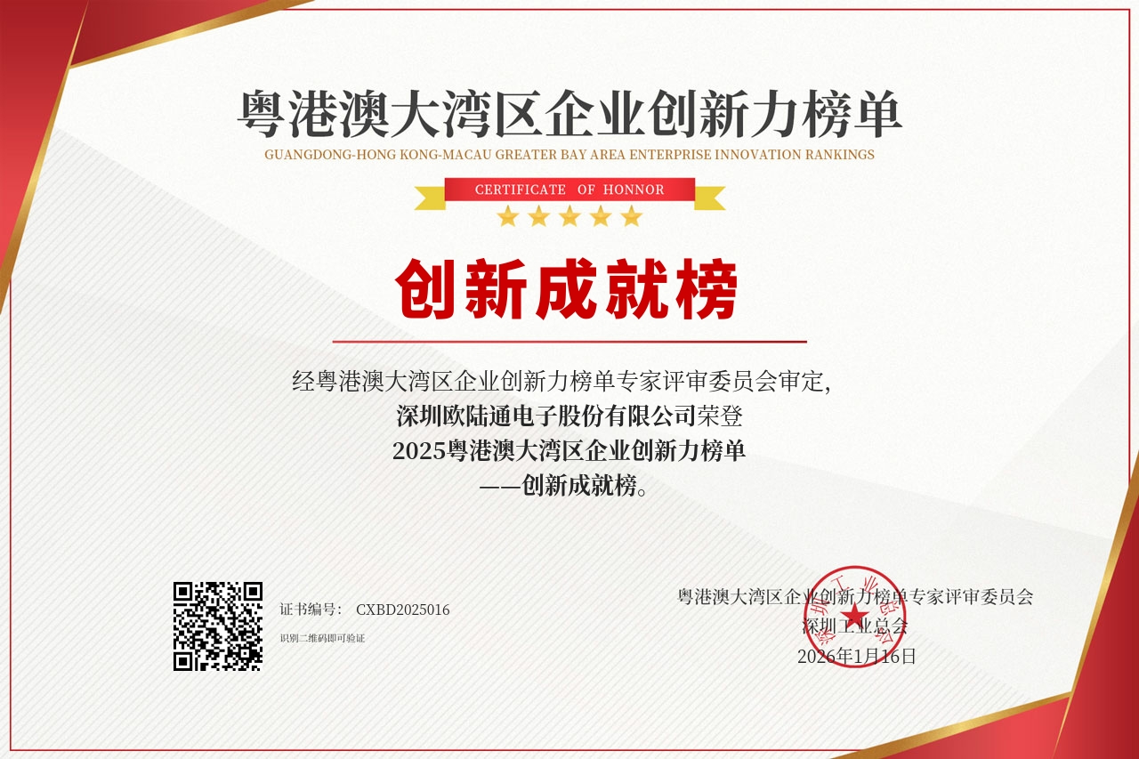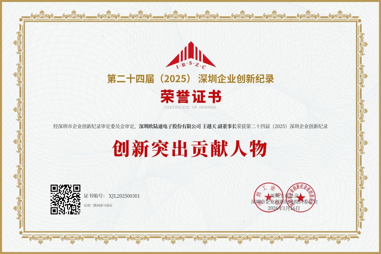 憑借著卓越的自主創(chuàng)新能力和顯著的市場表現(xiàn),歐陸通已連續(xù)六年蟬聯(lián)“粵港澳大灣區(qū)企業(yè)創(chuàng)新力榜單——創(chuàng)新成就榜”,公司副董事長王越天先生再度入選“粵港澳大灣區(qū)企業(yè)創(chuàng)新力榜單——創(chuàng)新杰出人物榜”。