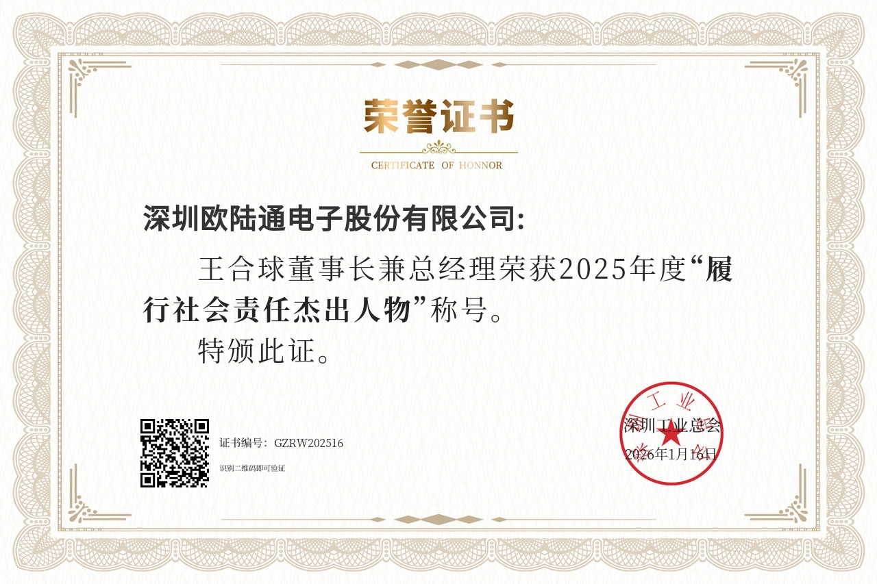 憑借在技術創(chuàng)新、區(qū)域產(chǎn)業(yè)引領、社會責任踐行等維度的綜合表現(xiàn),歐陸通一舉斬獲九項大獎。歐陸通入選“2025粵港澳大灣區(qū)企業(yè)創(chuàng)新力榜單-創(chuàng)新成就榜”,榮獲“深圳工匠培育示范單位”、“2025年度履行社會責任杰出企業(yè)”、“第二十四屆深圳企業(yè)創(chuàng)新紀錄-自主創(chuàng)新標桿企業(yè)”獎以及兩項“第二十四屆深圳企業(yè)創(chuàng)新(中國)紀錄”;歐陸通董事長兼總經(jīng)理王合球先生,榮獲“2025年度履行社會責任杰出人物”;歐陸通副董事長王越天先生,入選“2025粵港澳大灣區(qū)企業(yè)創(chuàng)新力榜單-創(chuàng)新杰出人物榜”,榮獲“第二十四屆深圳企業(yè)創(chuàng)新紀錄-創(chuàng)新突出貢獻人物”。